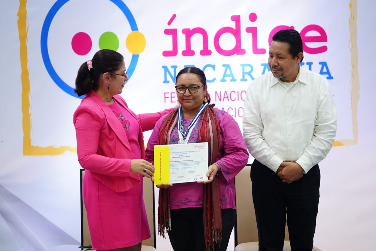 El reconocimiento simbólico por el MINED, lo recibieron Isaías Mena Silva y Brígida Matilde Sandino Ramírez; INATEC Karla Ivanova Espinoza y Carlos Humberto Hernández; en representación del CNU, Lesbia del Socorro Grijalva y Maritza Vallecillo Flores. Los demás participantes estarán recibiendo este reconocimiento posterior al evento.